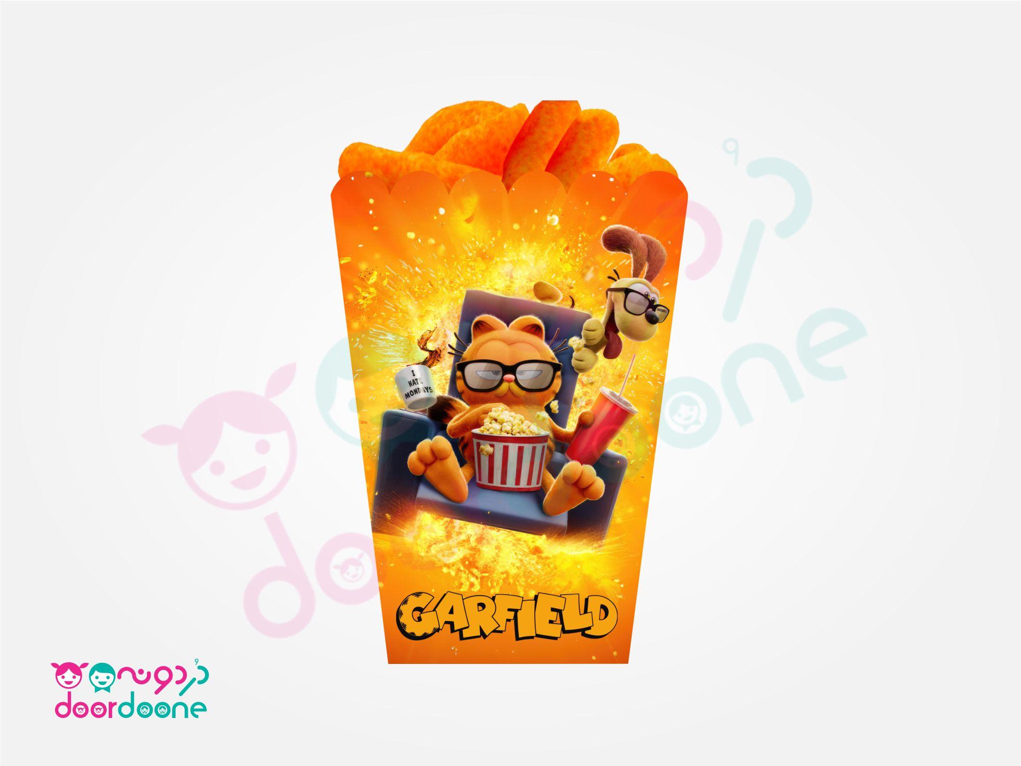 لیوان پاپ کورن (ابعاد: طول و عرض 12 سانتیمتر - ارتفاع 17 سانتیمتر) با تم گارفیلد همراه با نام کودک (یک عدد)